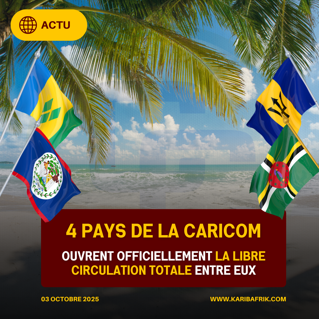 La Rédaction Karib Afrik 03/10/2025 La Rédaction Karib Afrik 03/10/2025 Libre circulation dans la CARICOM : quatre pays ont ouvert leurs frontières le 1er octobre 2025 Lire la suite