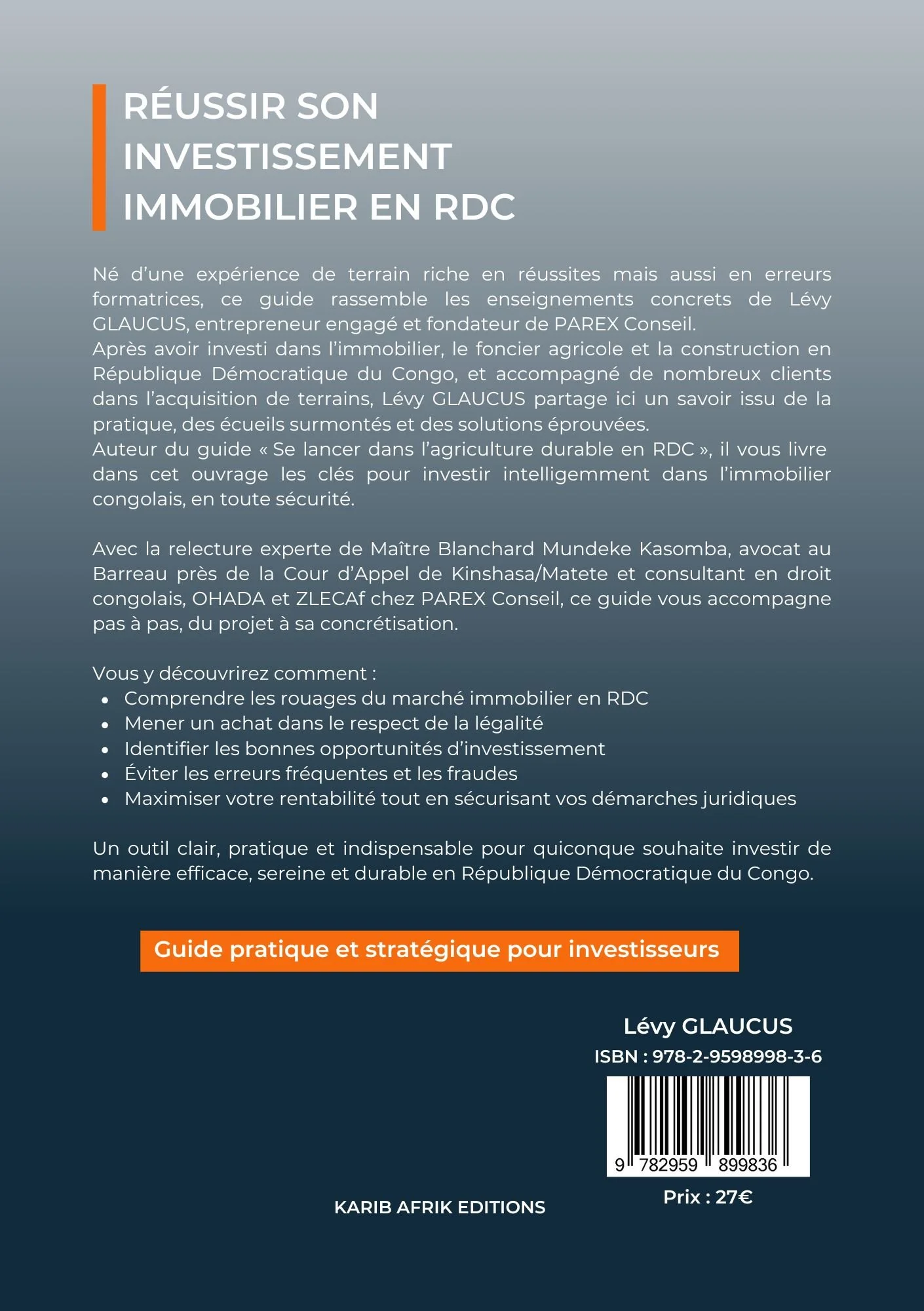 KARIB AFRIK EDITIONSConnecter l’Afrique et la Caraïbe Catégories : Sélectionnez une catégorie Immobilier Business Formation Droit Agriculture Karib’Library Immobilier | Business | Formation | Droit | Agriculture | Se lancer dans l'agriculture durable en RDC 11,90 € Ajouter au panier Ajout effectué ! Réussir son investissement immobilier en RDC 18,90 € Ajouter au panier Ajout effectué !